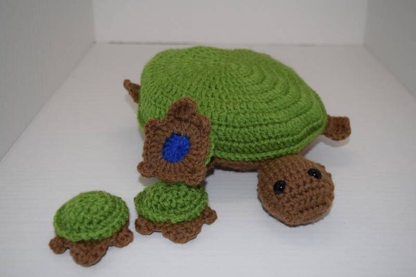 The Mama turtle has all her little baby turtles in her shell. There are 2 baby turtles per color. You lay them out and match them.